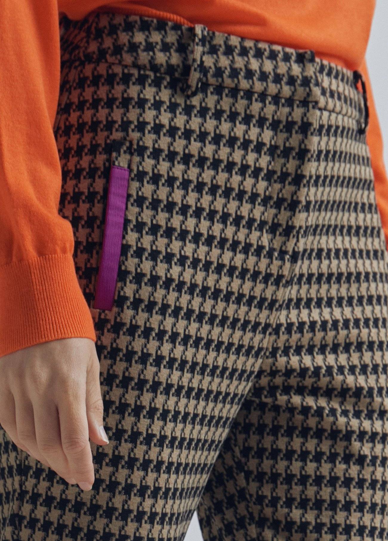 Calças de veludo, estampa de manchas pretas, pormenores de pequenas fitas de cor.