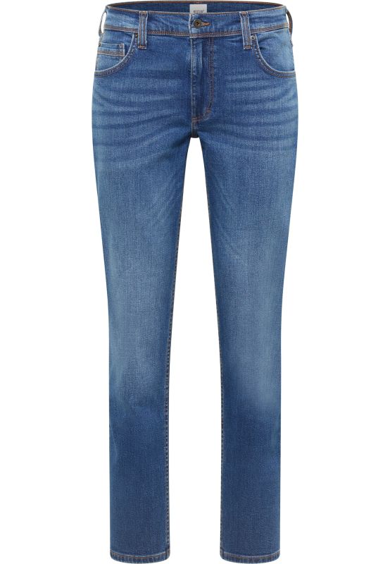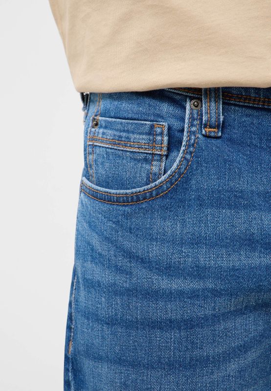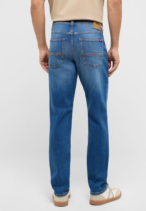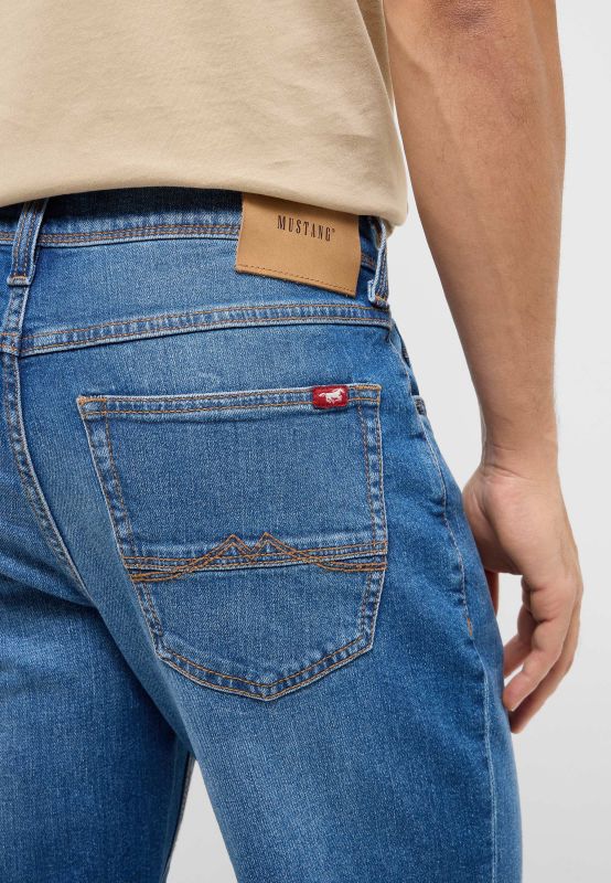 A lavagem desgastada, as costuras contrastantes e os vincos acentuam o visual autêntico.