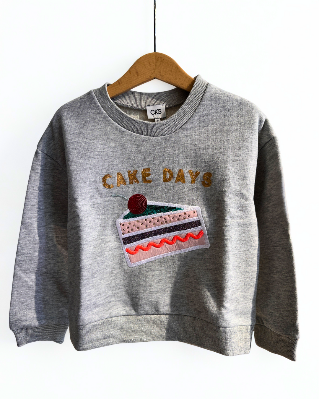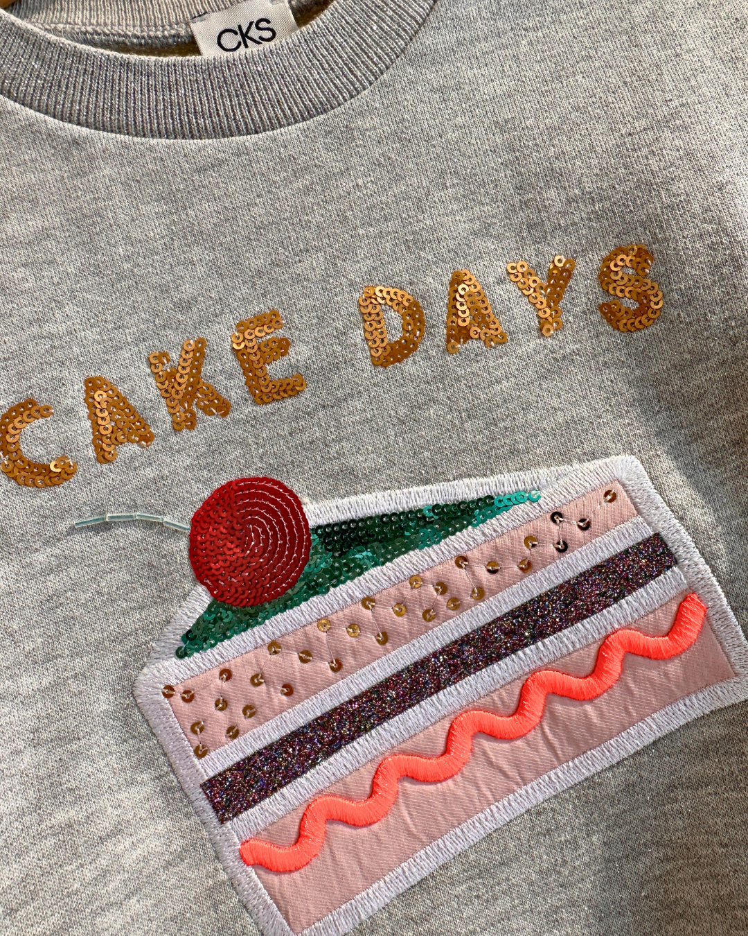 Camisola sem carda, pormenor de fatia de bolo na frente c lantejoulas e brilhos.
