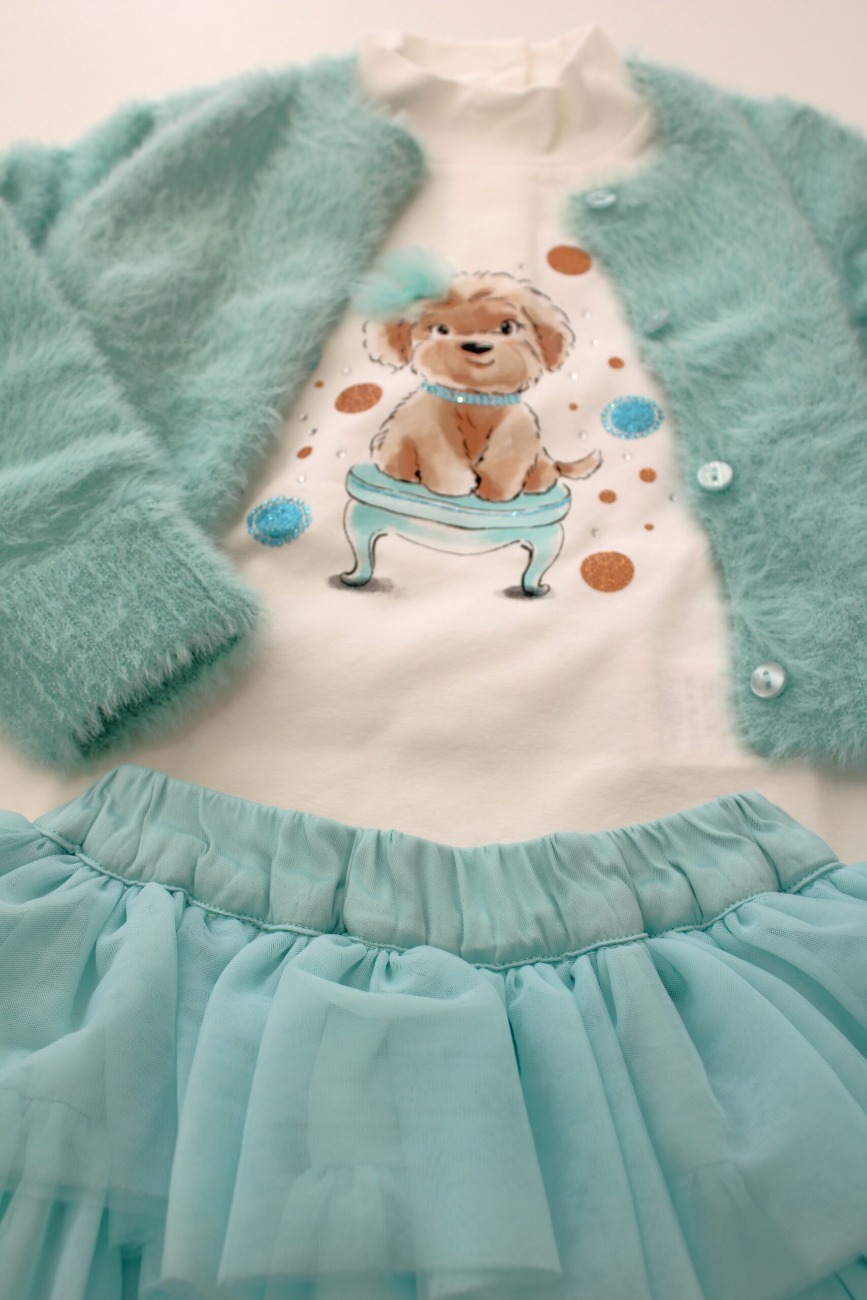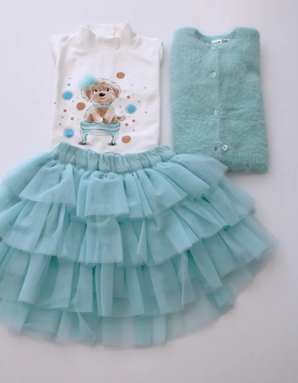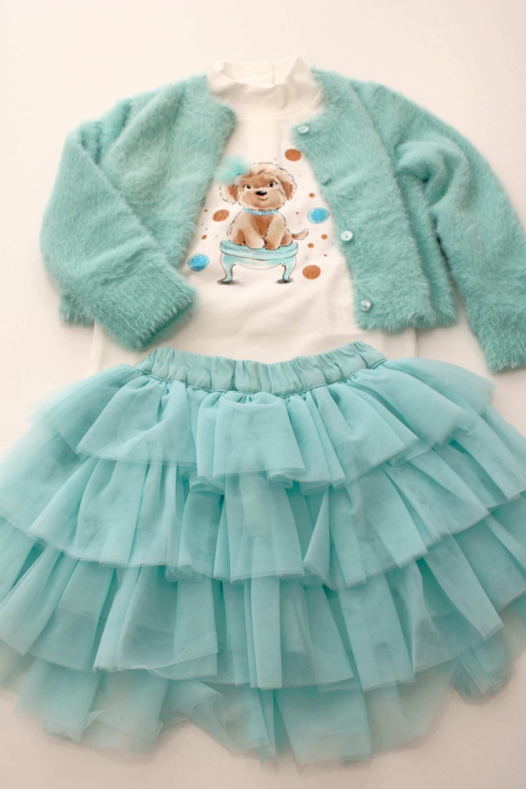 Conjunto de saia de tule, camisola de algodão e casaco de pelo macio.