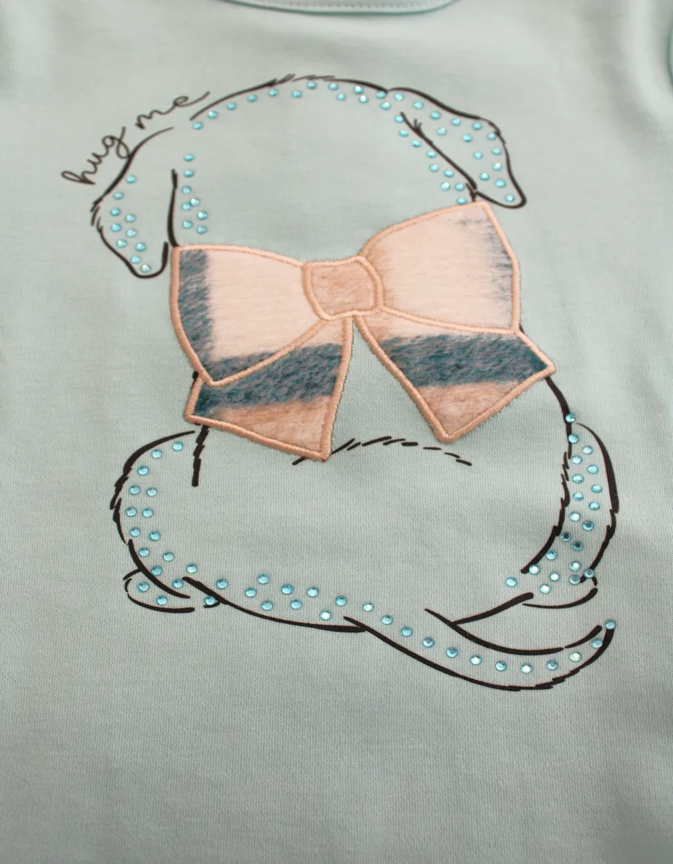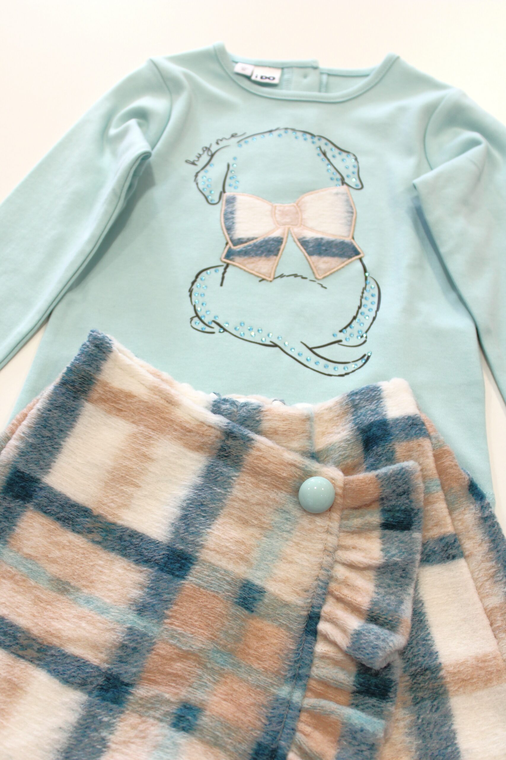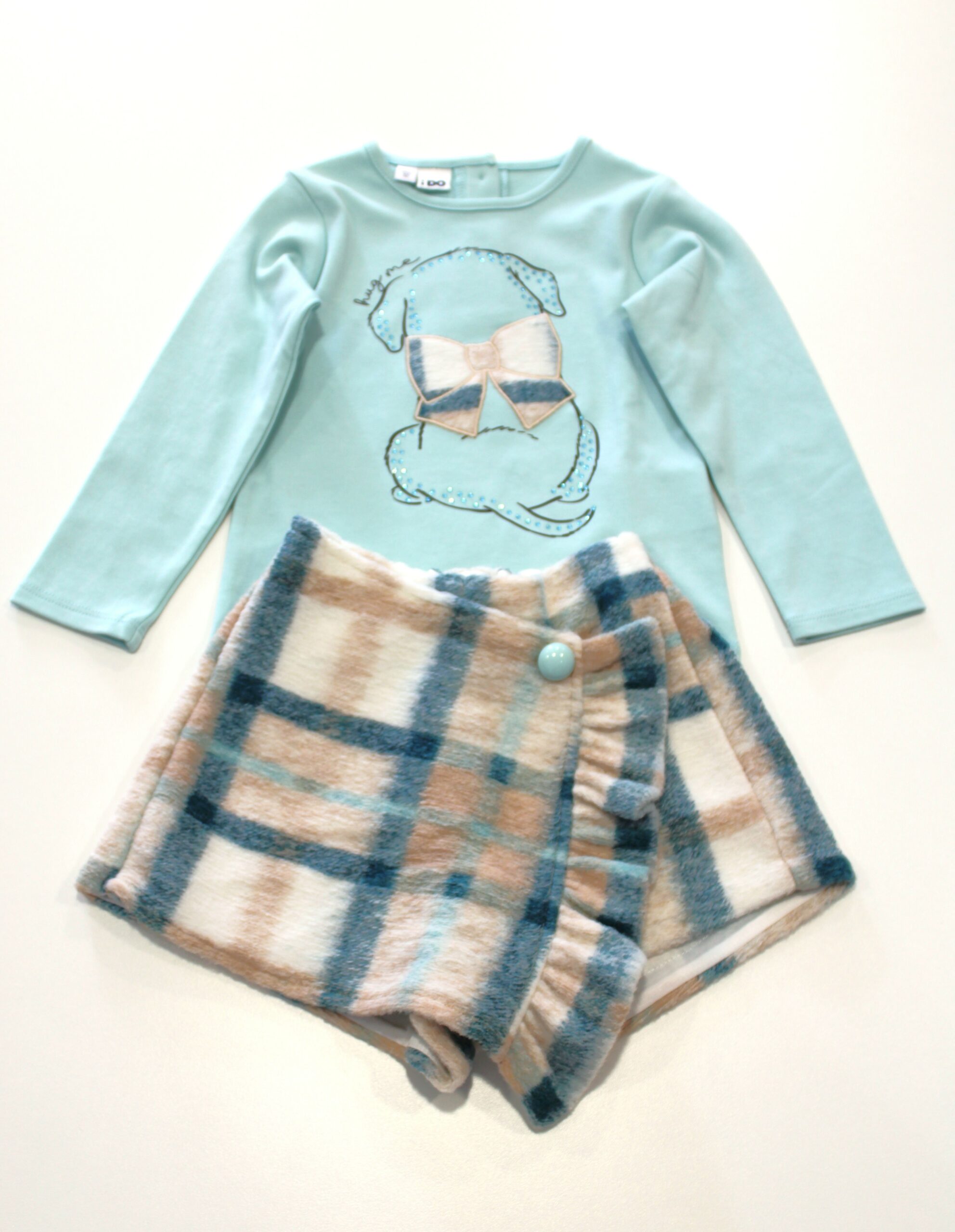 Conjunto de camisola de manga, com pormenor de cãozinho na frente. Calção saia ao xadrez.
