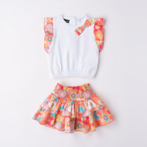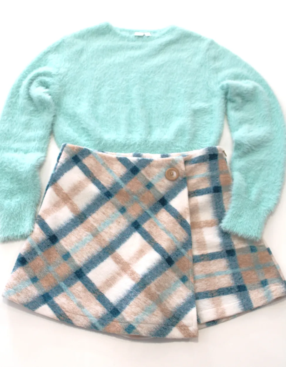Conjunto de camisola de malha de pelo macio e calção saia ao xadrez