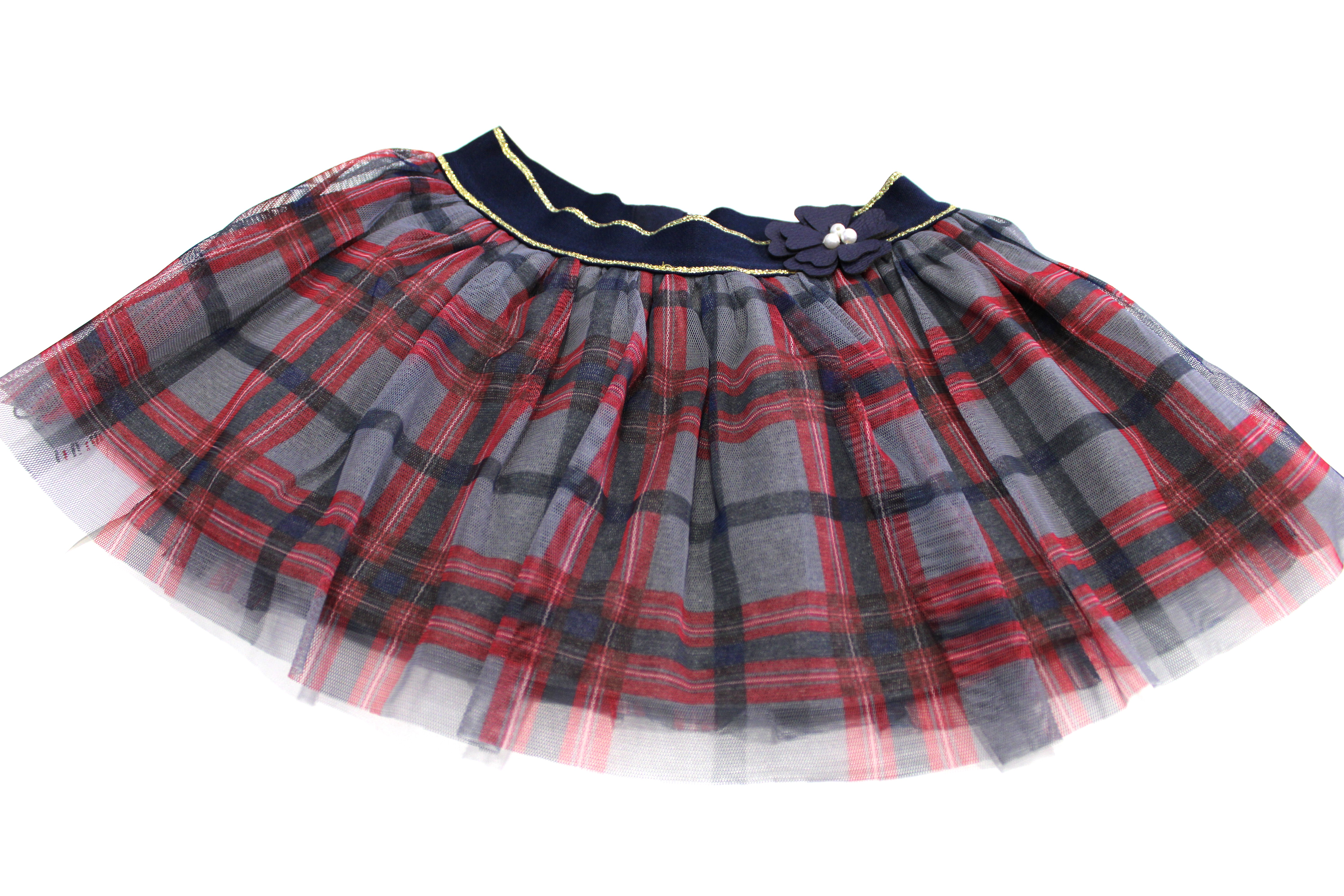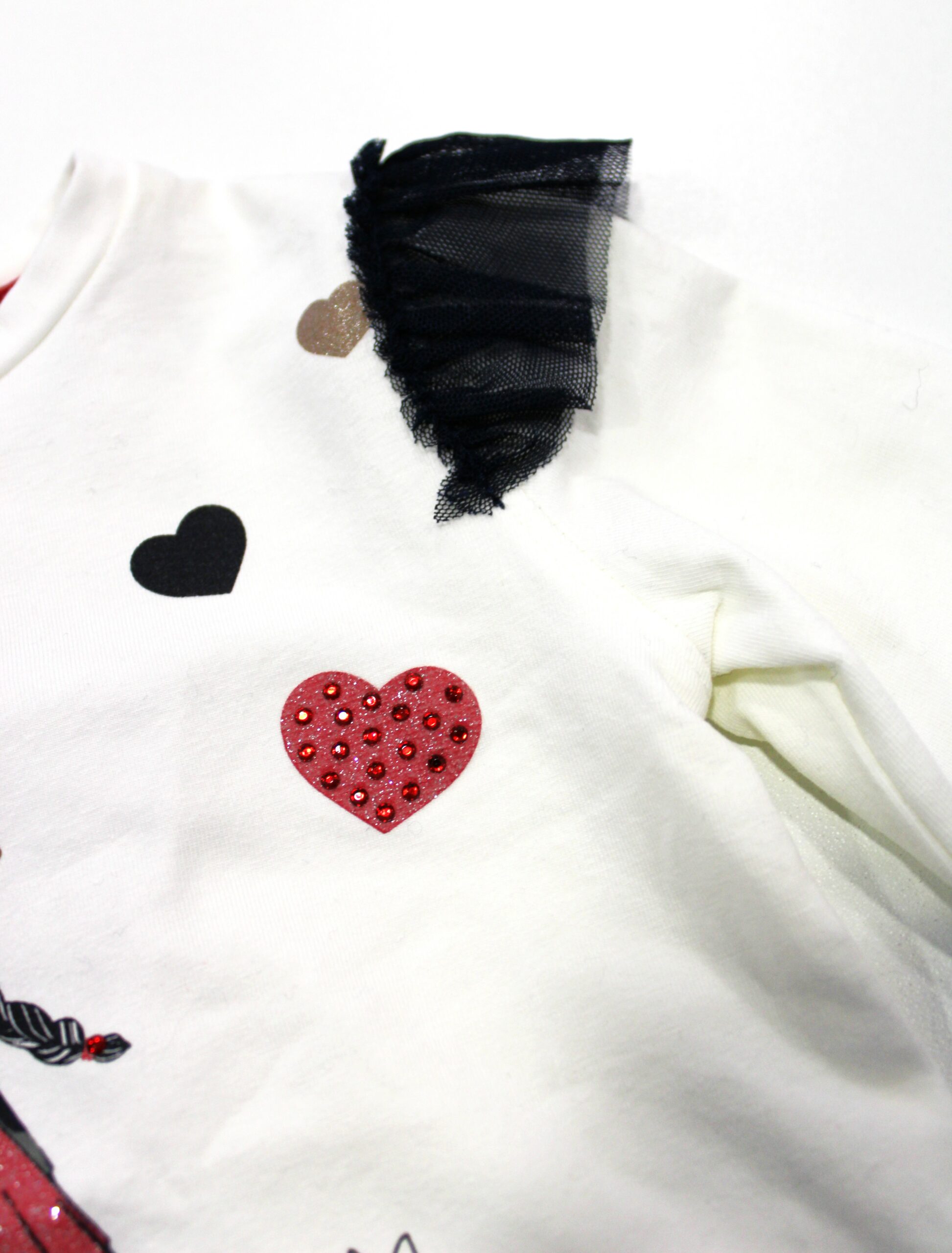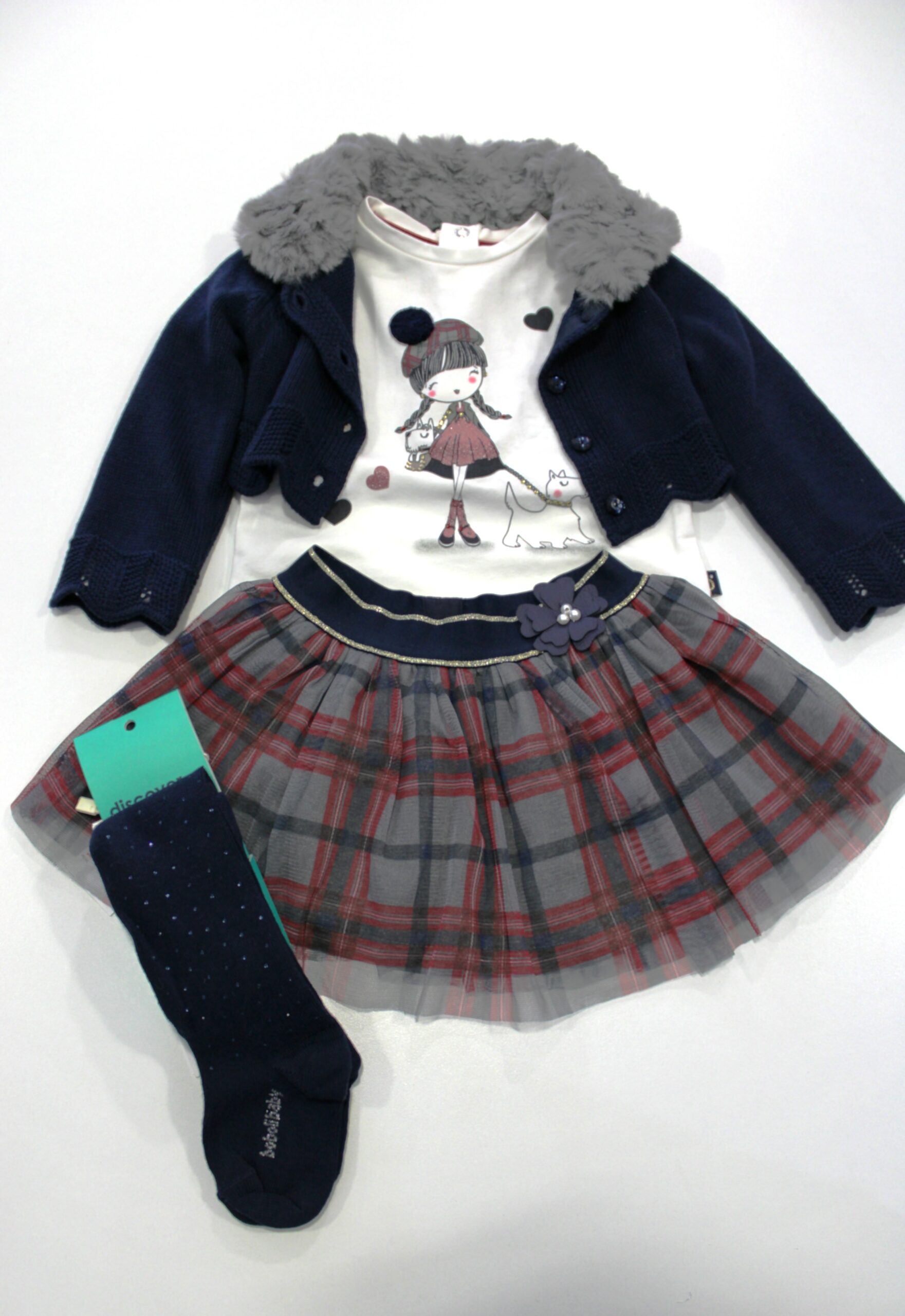 Conjunto de Casaco de malha, camisola de algodão, saia de tule e collant.