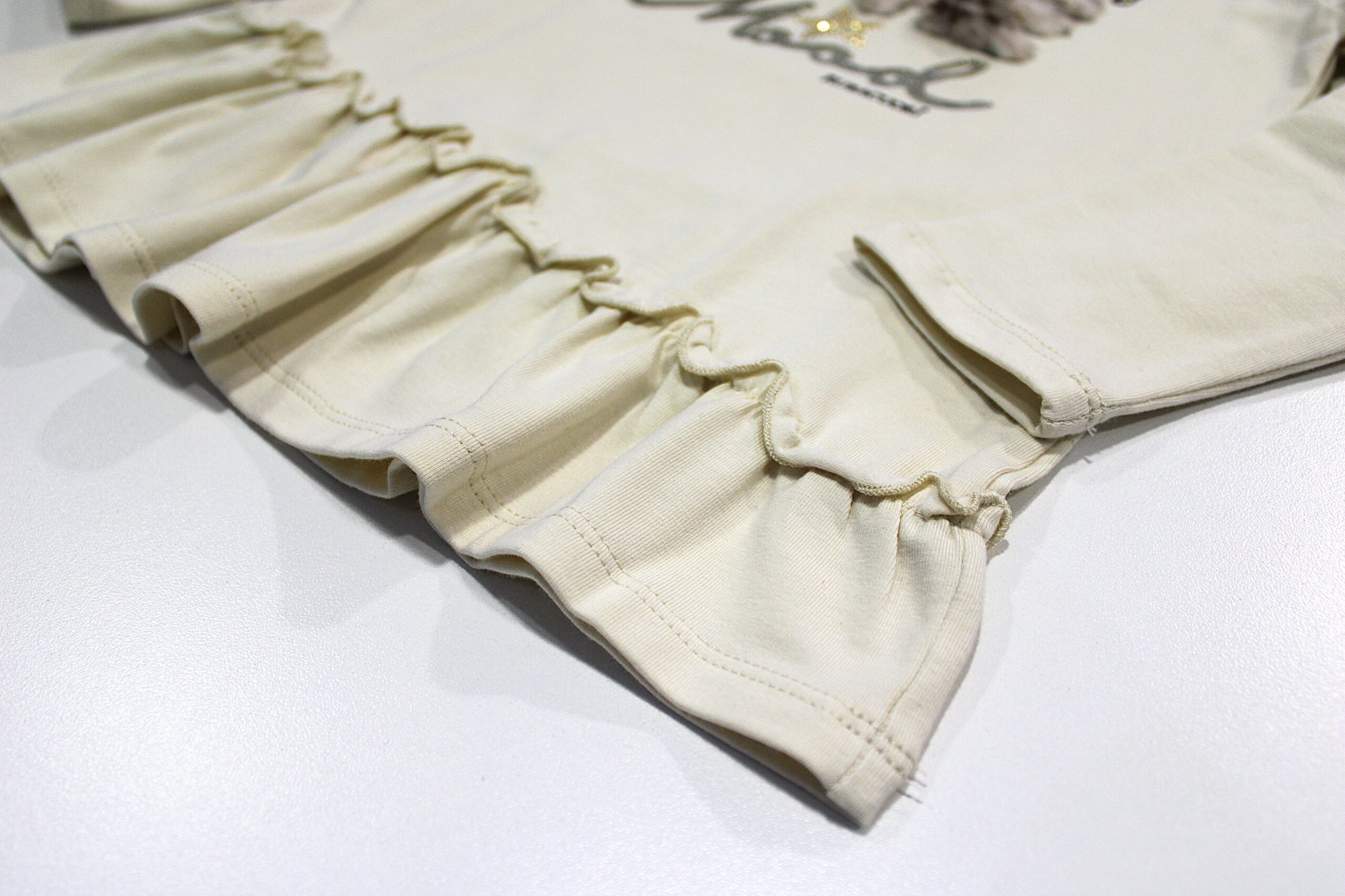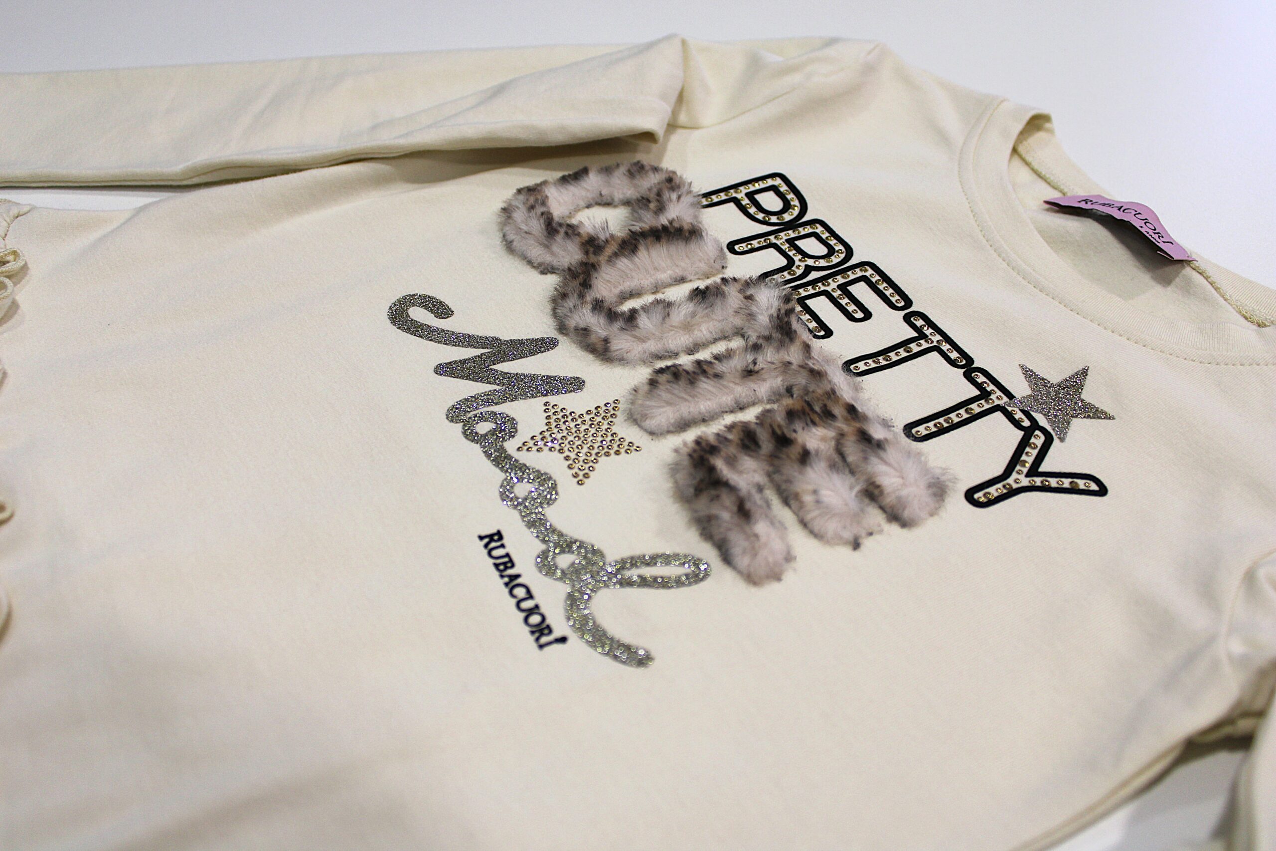 Túnica com folhos na cinta, pormenor de pelo nas letras no peito.