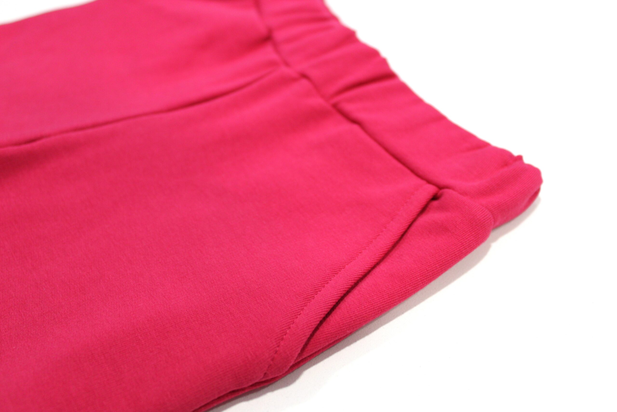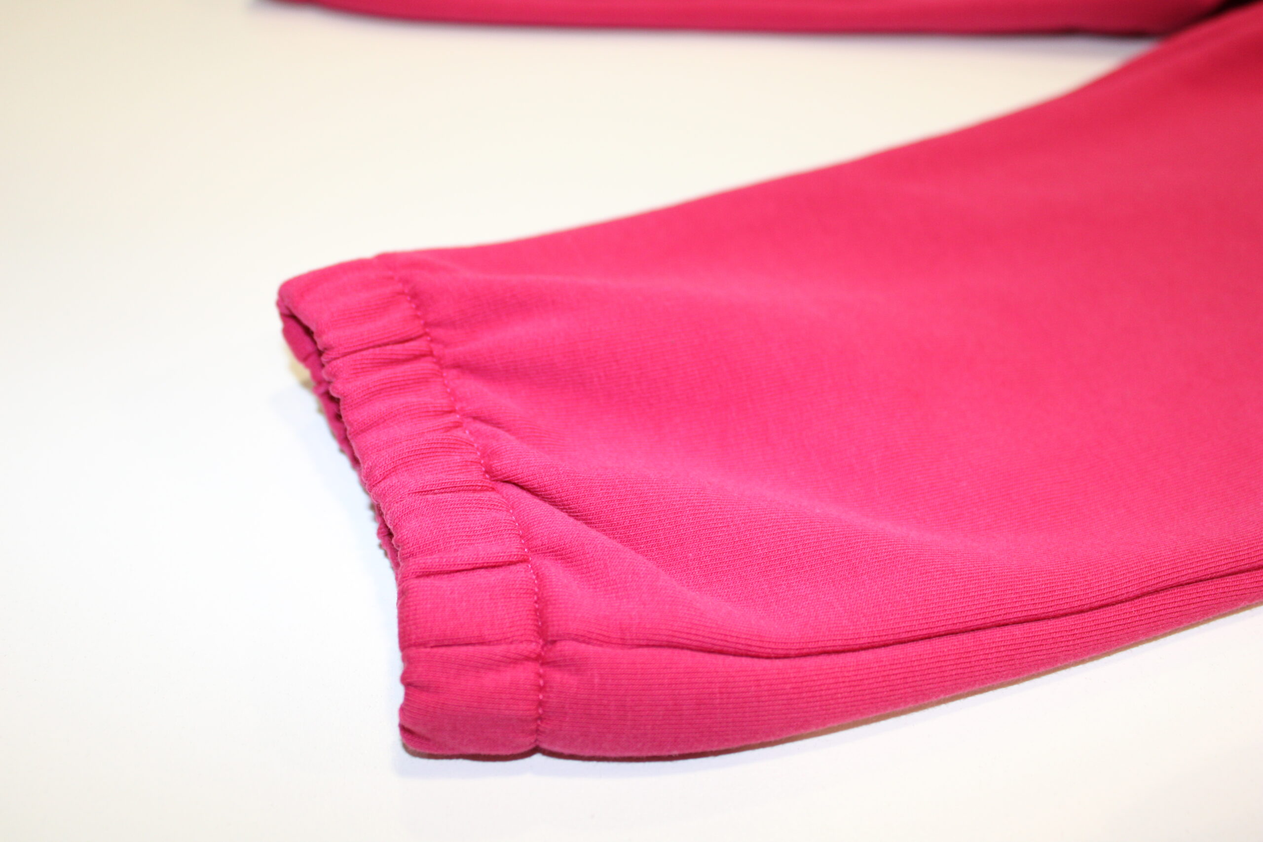 Calças de dois bolsos e punhos nas pernas.