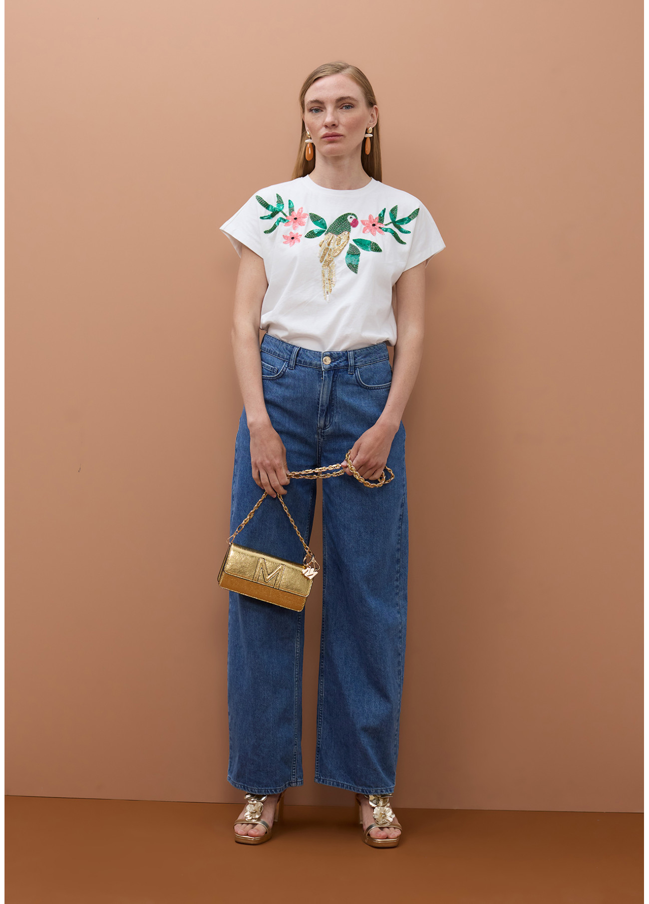 T-shirt de algodão de manga curta com deslumbrante papagaio bordado em lantejoulas.