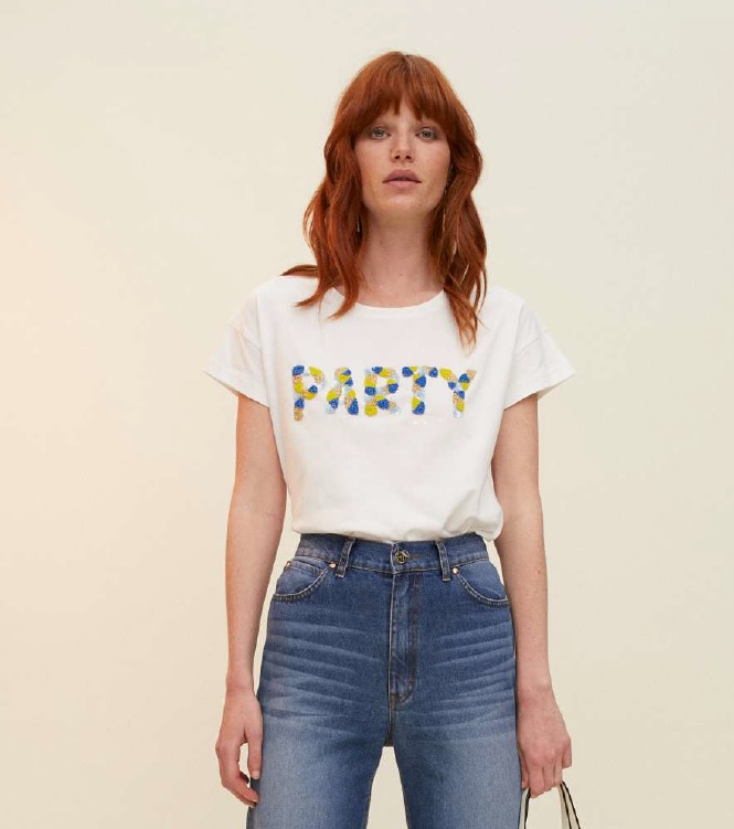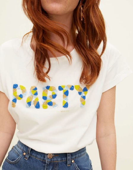 T-shirt de algodão, “PARTY” em missangas coloridas