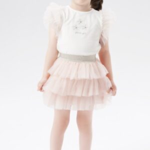 Vestido de festa manga cava, com pormenores em renda branca e cinto de organza com flores.