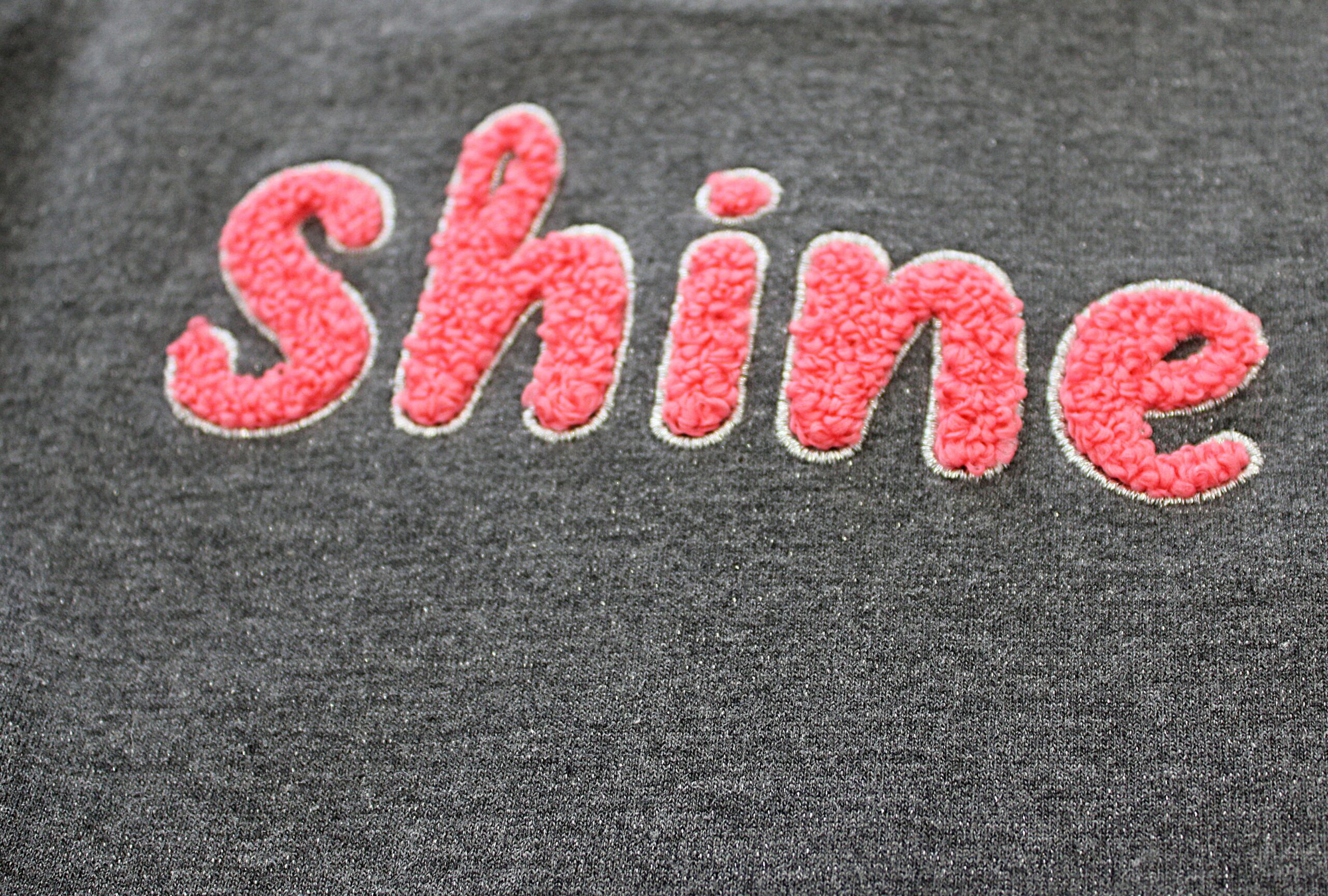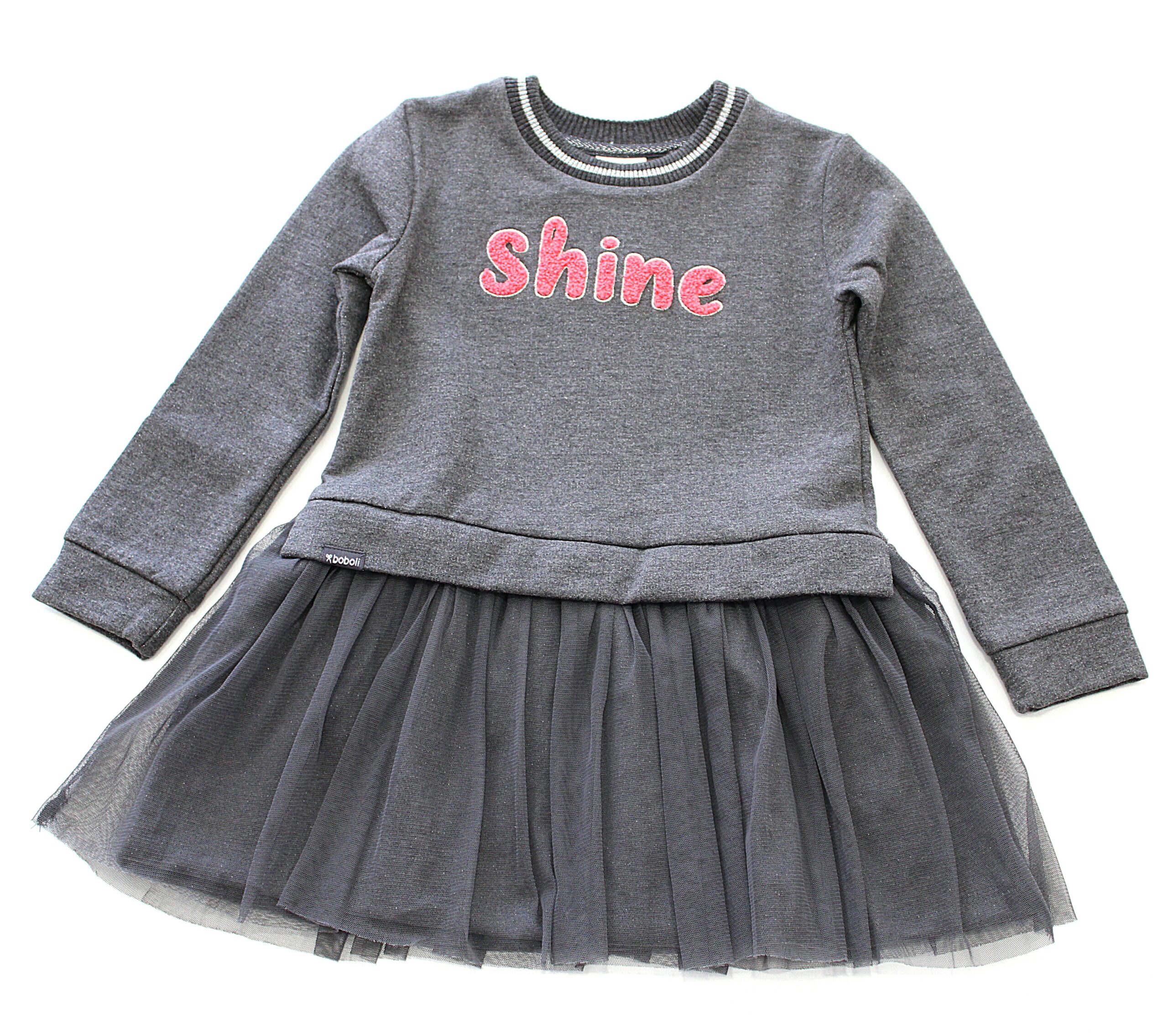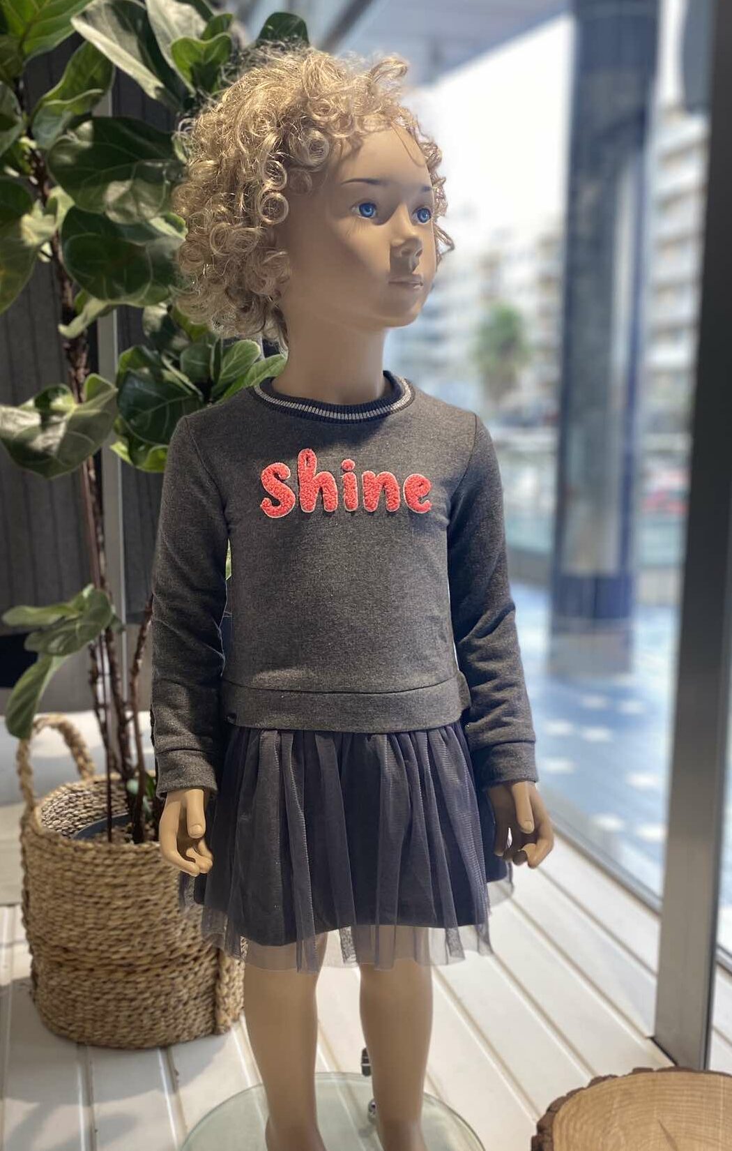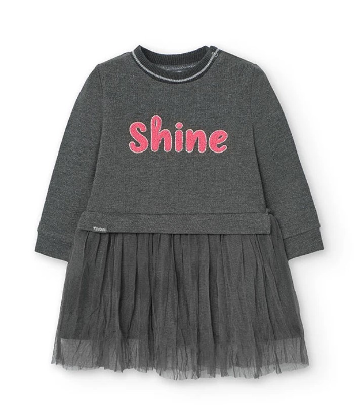 Vestido com carda interior, pormenor de letras em relevo na frente.