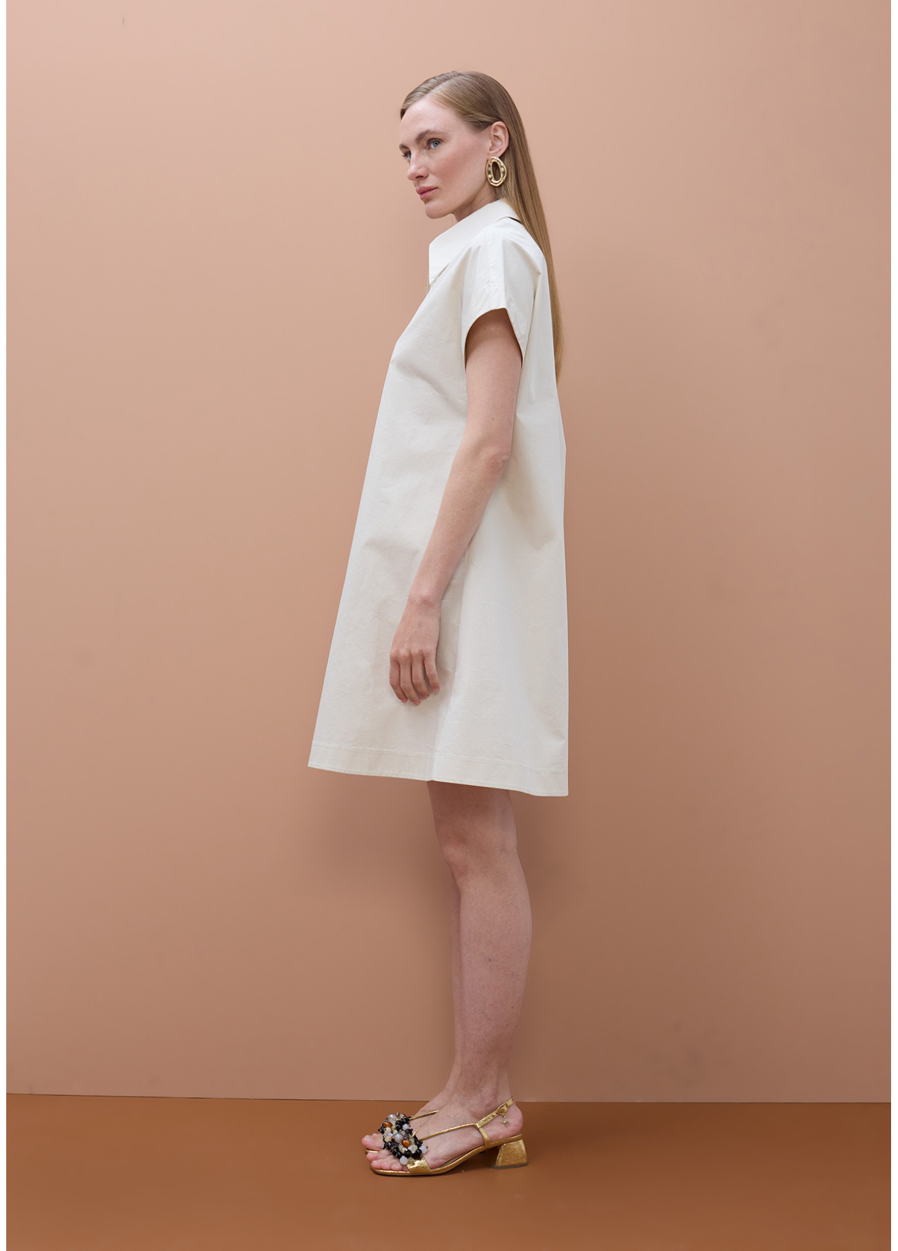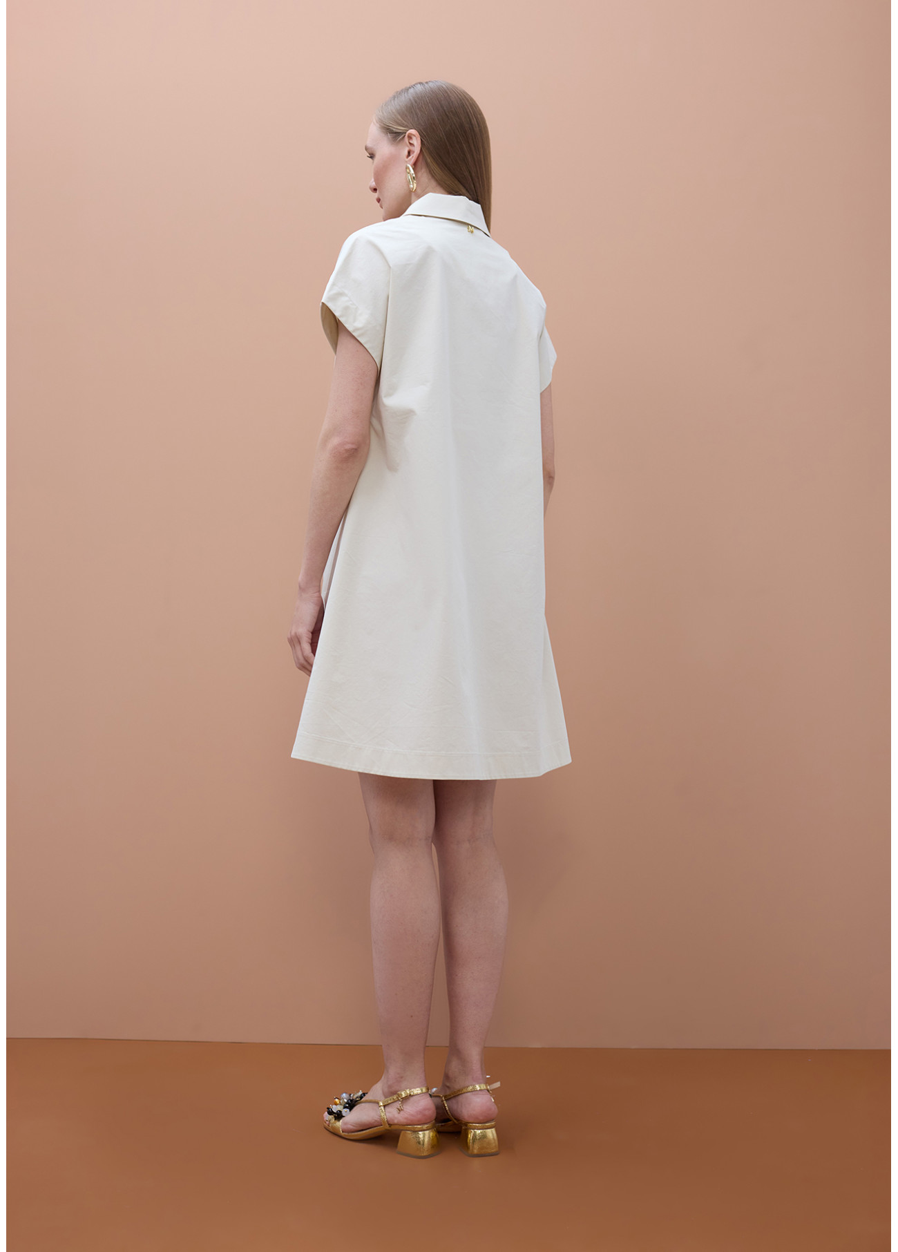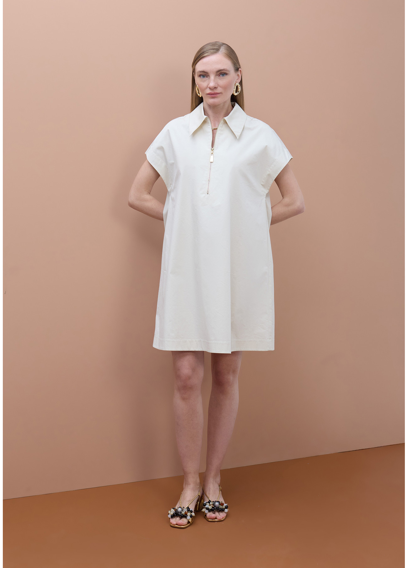 Vestido camiseiro curto com mangas curtas e fecho de correr elegante na frente.
